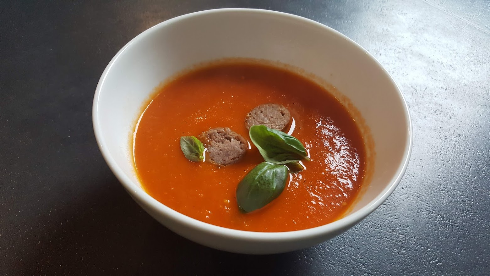 Verdeel de soep over 2 kommen en verdeel de worst en basilicum erover.