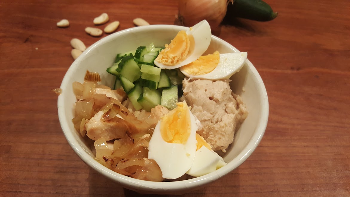 maak nu het bord op, begin met een bedje van de bloemkool rijst en verdeel de kip blokjes en de komkommer op garneer met de mango blokjes en de tauge, en als laatste een eetlepel van de 'pindasaus'