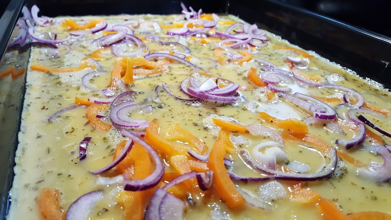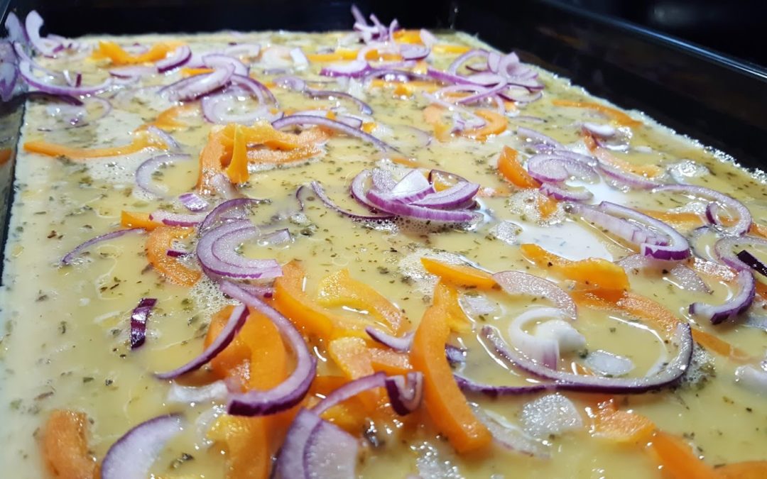 Haal nu de ovenschaal uit de oven als deze goed is voor verhit en giet je eimengsel hier in zodat deze goed is verdeeld en alvast een klein beetje bakt, op deze manier vormt de bodem voor je pizza alvast een beetje