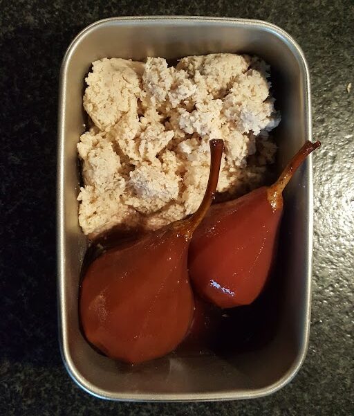 Serveer de pap met de peertjes ernaast en over giet deze met een beetje rest sap(wel even door een zeef halen), en garneer de pap met de amandel snippers