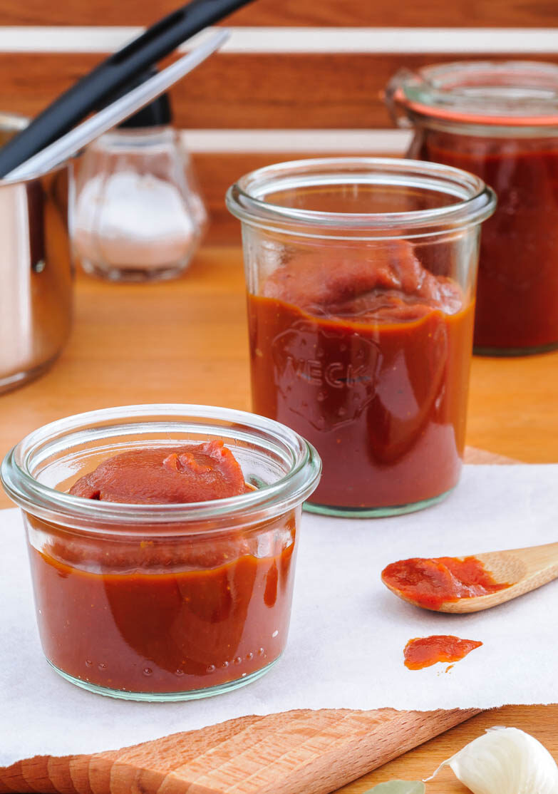 Voeg de balsamicoazijn en de paprikapoeder toe en roer goed door elkaar. Leg het laurierblad in de saus en laat op een hele lage pit rustig trekken en een beetje indikken. Proef af en toe en als de saus goed smaakt en voldoende dik is haal je het laurierblad eruit. Indien gewenst kan je nog wat extra azijn en/of zout en peper toevoegen. En wil je toch graag een zoete ketchup voeg dan gerust nog wat suiker toe. Voor een echt fijne ketchup wrijf je de saus nog door een zeef maar dat maar dat kan je ook laten zitten. Schep in schone potten of flessen en laat helemaal afkoelen.